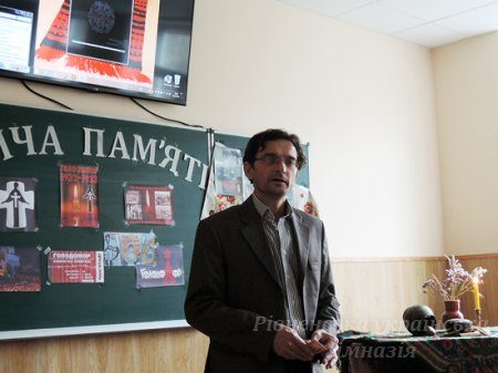Присутні згадали про пекло, створене в Україні в 20-х – 30-х роках ХХ століття людиноненависницьким комуністичним режимом, який вирішив голодом поставити український народ на коліна, змусити його будувати «комунізм» на кістках мільйонів безневинних жертв. Учні читали поезії, присвячені нашим співвітчизникам, що померли найстрашнішою смертю – смертю від голоду. Слова скорботи про померлих дочок і синів пролунали з уст Білої постаті України (Євчук О., учениця 10-А кл). Учитель історії Сацик С.П. виступив перед присутніми з історичною довідкою про цей період в історії нашої країни.