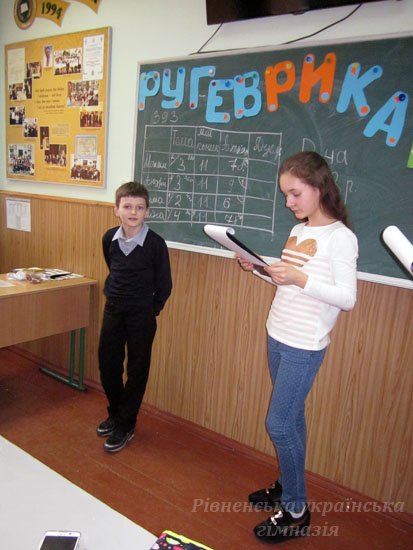 29 лютого гімназисти 5-А класу, а 2 березня учні 5-Б класу брали участь в інтелектуально-розважальному шоу «РУГ-Еврика». Психолог гімназії Світлана Леонідівна, ведучі Войтко Анастасія та Присяжнюк Олександр підготували цікаві змагання для ерудитів-п’ятикласників: Гнипа Віталія, Толочка Ервіна, Негоди Євгенії, Осіпової Олександри (5-А); Трифана Максима, Полюховича Андрія, Водік Аліни та Омельковець Емілії (5-Б). Конкурс «Мій коник» продемонстрував усім присутнім, які цікаві хобі мають їхні однокласники. Толочко Ервін захоплюється філателією, Гнип Віталій колекціонує вхідні квитки на культурні заходи та проїзні квитки на різні види транспорту (наприклад, на літак), Женя Негода багато років танцює в ансамблі «Джерельце», а Максим Трифан у танцювальному колективі «Флеш». Олександра Осіпова серйозно займається співами, а Емілія захоплюється грою на фортепіано. Свої інтереси Аліна Водік реалізовує у фігурному катанні, а Андрій Полюхович захоплюється веб-дизайном. Переможцями гри стали Гнип Віталій та Полюхович Андрій, срібними призерами – Толочко Ервін та Аліна Водік. ІІІ та IV місця розділили Негода Євгенія та Осіпова Олесандра, Трифан Максим та Омельковець Емілія. Усі учасники гри отримали приємні подарунки, а глядачі - яскраві емоції.