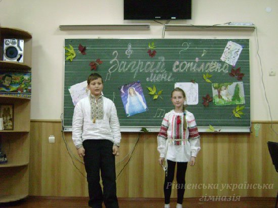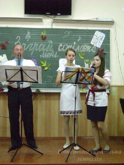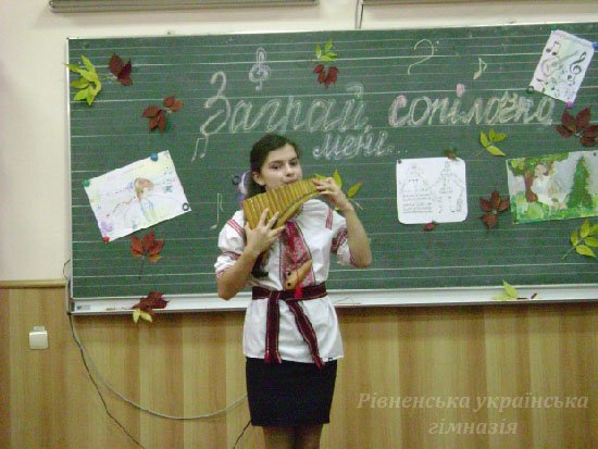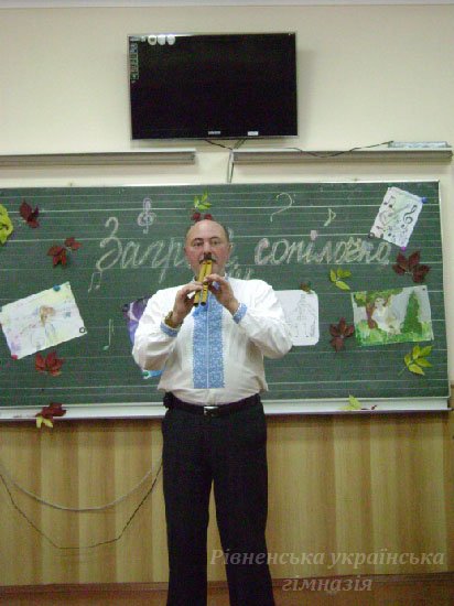 1 жовтня у Рівненській українській гімназії традиційно відзначали Міжнародний день музики. Мистецька вітальня «Заграй, сопілочко, мені..» зібрала гімназистів шостих класів - шанувальників народного мистецтва. До нас у гості завітали студенти класу народно-духових інструментів Рівненського музичного училища, викладач Федоров Ігор Анатолійович.